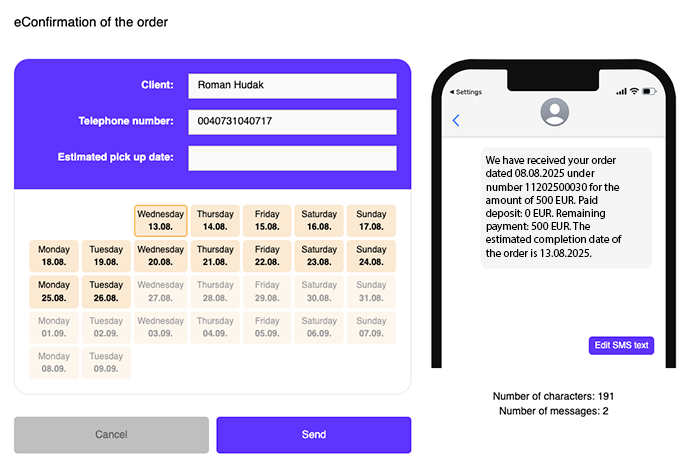 You don’t have to print an order card for the client. Send order information immediately via SMS when saving the order! When the order is created, the client receives an SMS with the order number, deposit amount, remaining balance, and expected completion date. You can also add measurement results from the work card (Sph/Cyl/Axis/Add).